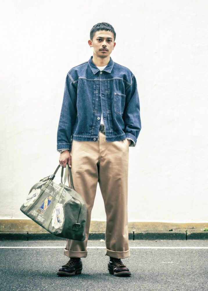 【着用アイテム】EARLY MILITARY CHINOS 1945 MODEL|割り縫い仕様で斜めポケットのベーシックスタイル。