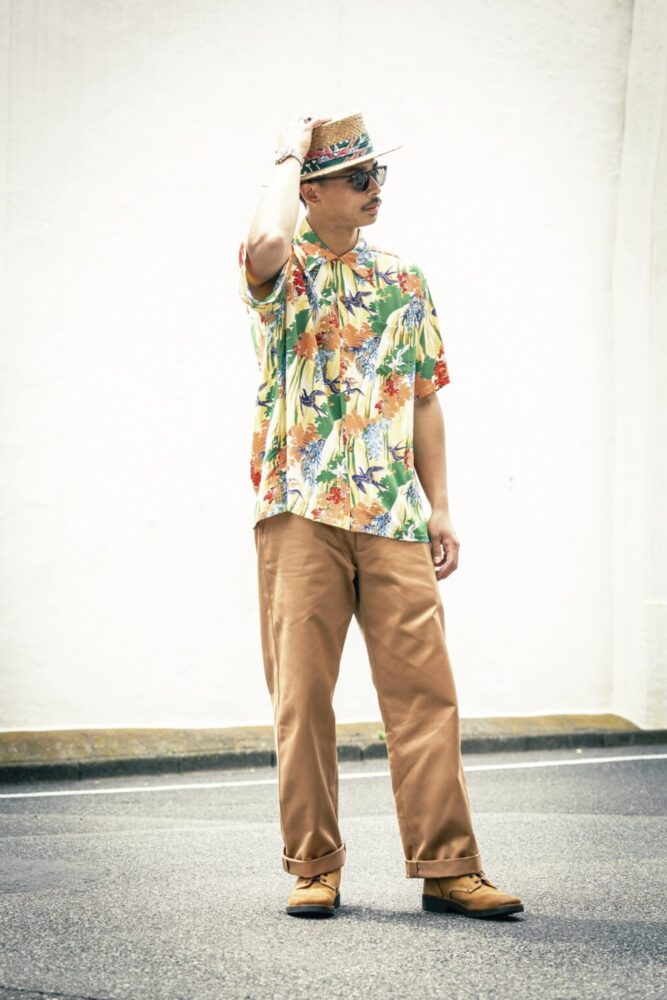 チノパンの色は“02キャメル”をチョイス。その味わい深い色味を軸にアースカラーでまとめた、夏の正解スタイリング。トップスにはアロハシャツとカンカン帽をセレクトして、清涼感をプラス。M-43ブーツを履くことで、全身に統一感が生まれている。