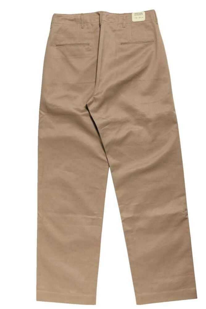 1945年型を再現。チノパンといえば一般的に、割り縫い仕様に斜めポケットのスタイルが主流。1942年型と同様にU.S. ARMY刻印入りメタルボタン、ポケット口は両玉縁仕様を採用し、全体的にゆったりとした太めのシルエットだ。1万7380円