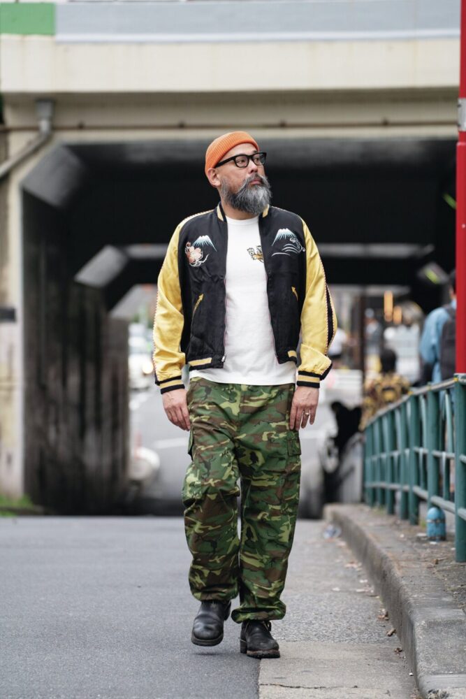 テーラー東洋のスカジャン10万3400円、バズリクソンズのニットキャップ7590円、プリントTシャツ9790円、ERDLパンツ3万9600円(すべてジャンキースペシャル) エンジニアブーツ、メガネ(本人私物)