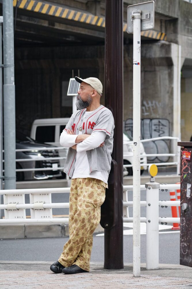 ホワイツビルのベースボールシャツ、フットボールTシャツ、バズリクソンズのフロッグスキンパンツ、スニーカー、キャップ(すべて本人私物)