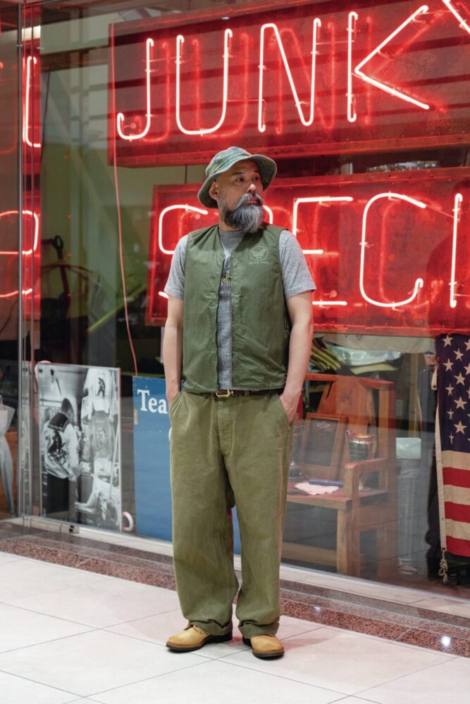 バズリクソンズのハット1万2100円、E-1ベスト3万8500円、Tシャツ1万1880円、M-43ブーツ8万6900円(すべてジャンキースペシャル) バズリクソンズのM-1943パンツ(本人私物)