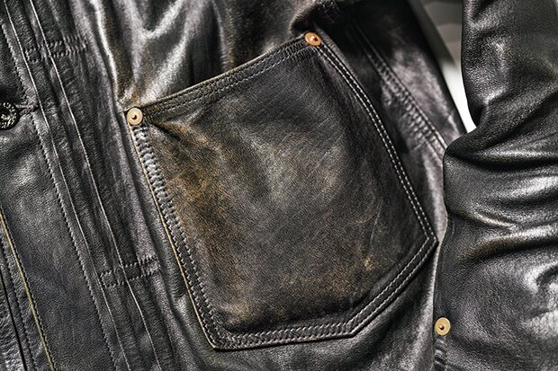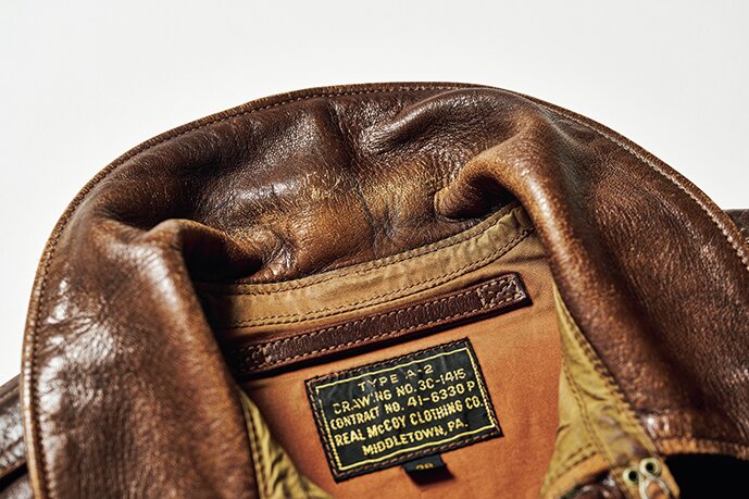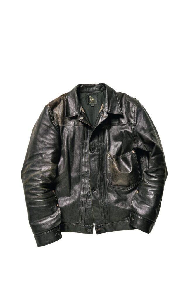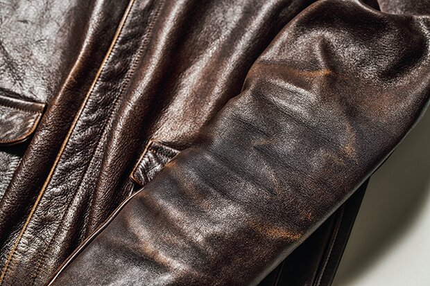 小川 俺が持っている〈リアルマッコイズ〉の[A︱2]がその“茶の茶芯”にあたるんだけど、鞣した後に一度茶色で芯まで染めた後に、さらに表面を茶色で染める、ということだね。表面の黒が剥がれてブラウンが露出するのはいかにも茶芯らしくてかっこいいんだけど、茶の茶芯のようにブラウンのグラデーションが現れるようなエイジングもいいんだよな。