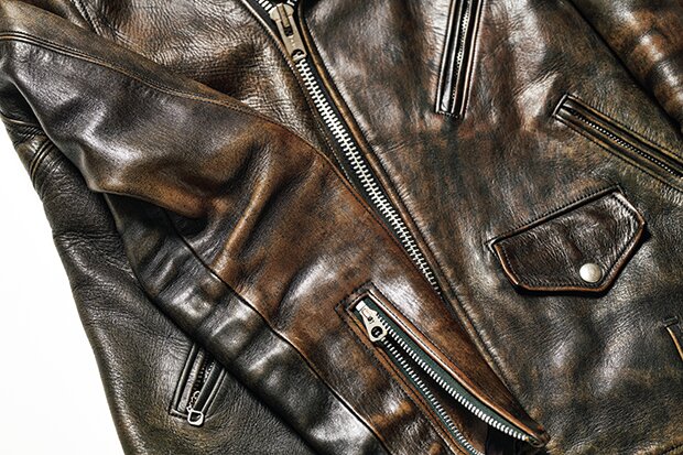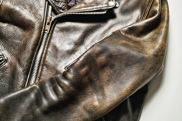 愛用歴は約8年。いわゆる「黒の茶芯」で、鞣した後の革を一旦ブラウンに染めた後、その上から表面をブラックで染めあげている。全体的にまばらに茶が現れており、雰囲気抜群な1着だ。
