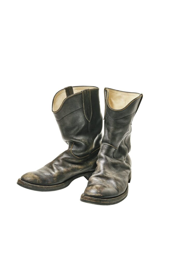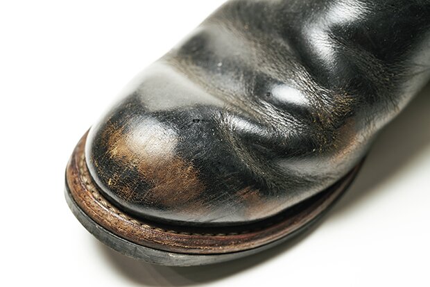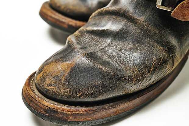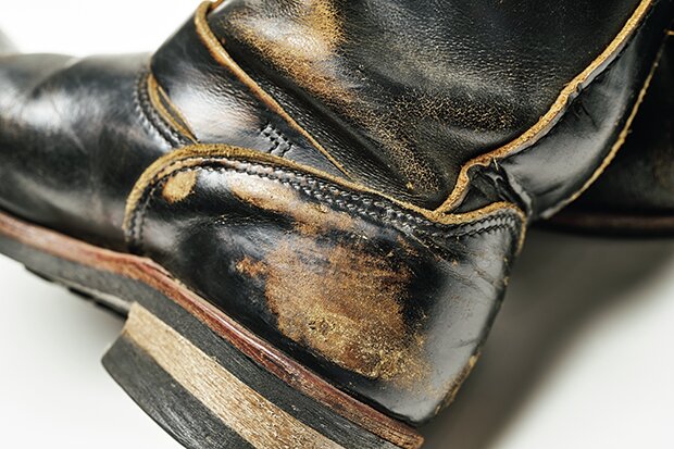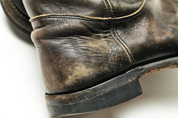愛用歴15年で、この中で最も古株。下地のブラウンが激しく露出しているだけでなく、シャフト(筒)の波打つように刻まれたシワやソールの減り具合、ステッチのほつれなど、とにかくアジのある1足だ。