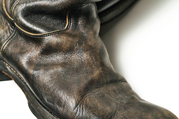 愛用歴6年。「ファインクリーク」の革ジャンで使用される馬革を使用。トータルコンセプターとしてモヒカン小川も開発に携わった1足だ。ブラウンのなだらかな露出具合は革ジャンのそれを思わせる。