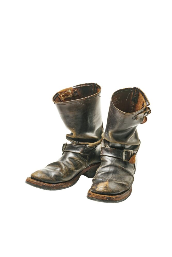愛用歴は7年。先芯のないエンジニアブーツで、つま先に大きくブラウンが現れている。また、ヒールの内側も大きくブラウンが露出しており、脱ぐ際に逆足を引っ掛けている癖がここでも現れている。