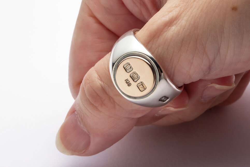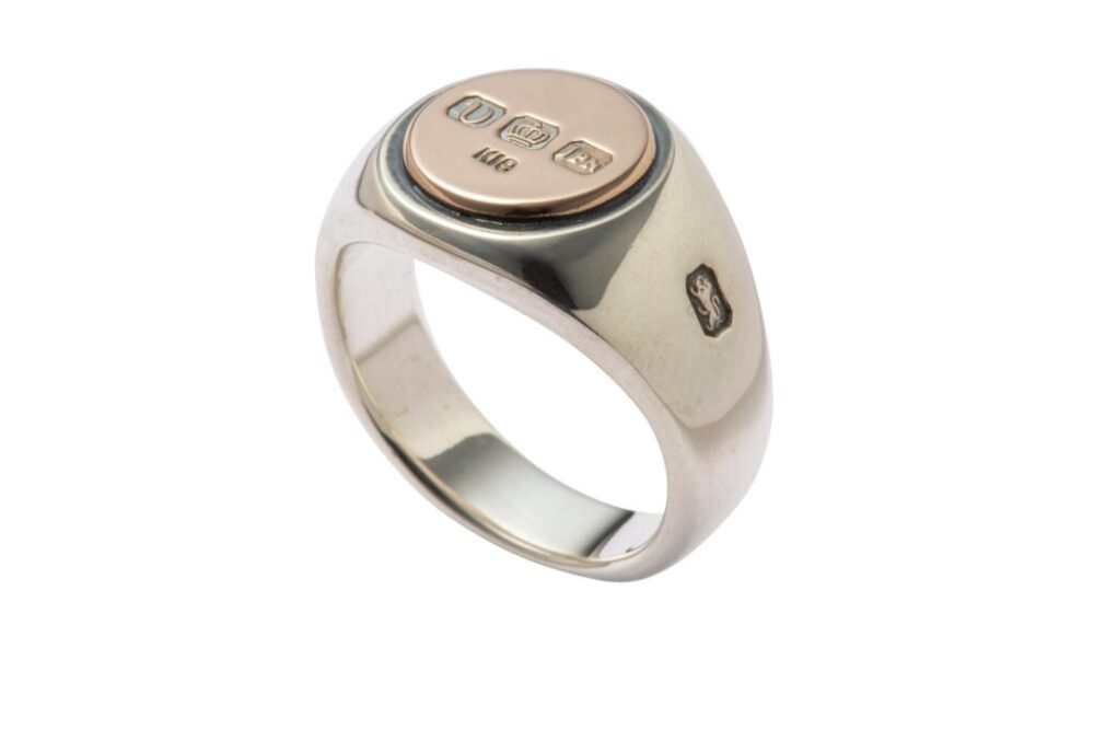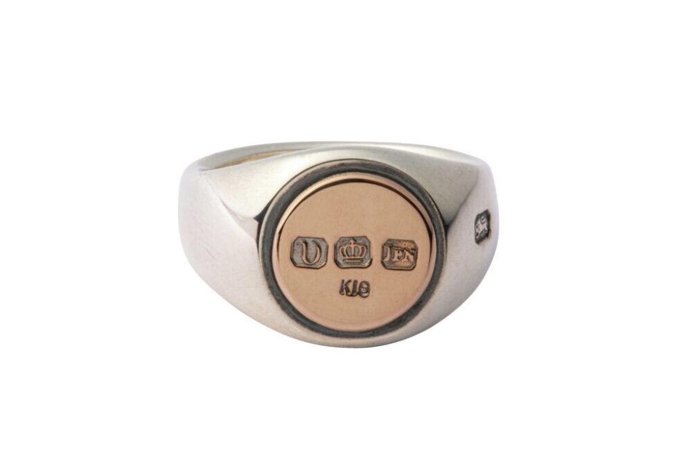 貴金属製品の品質保証を示す刻印「ホールマーク」をモチーフにしたリング。リングボディにシルバー925、トップに鏡面仕上げをした18金ピンクゴールドを使ったラグジュアリーなデザイン。存在感のあるボリューム感も、軽装になるこの季節のファッションのアクセントになってくれる。リング最大幅13㎜程度 (リングサイズ9号~25号まで製作可能)。4万4000円