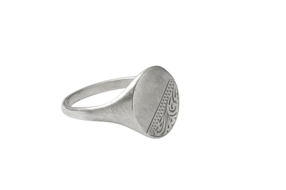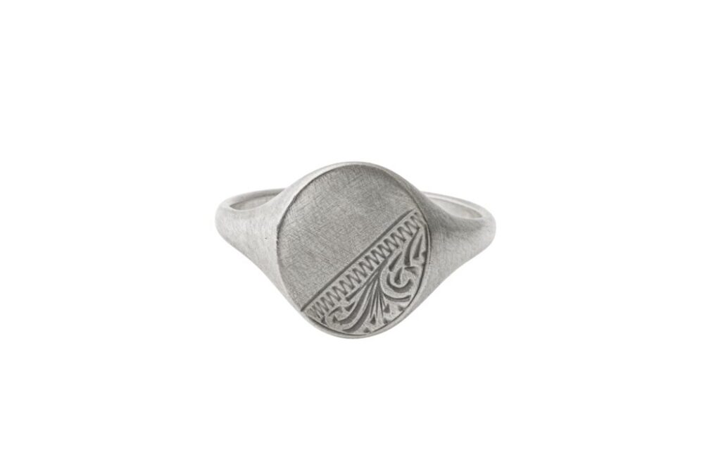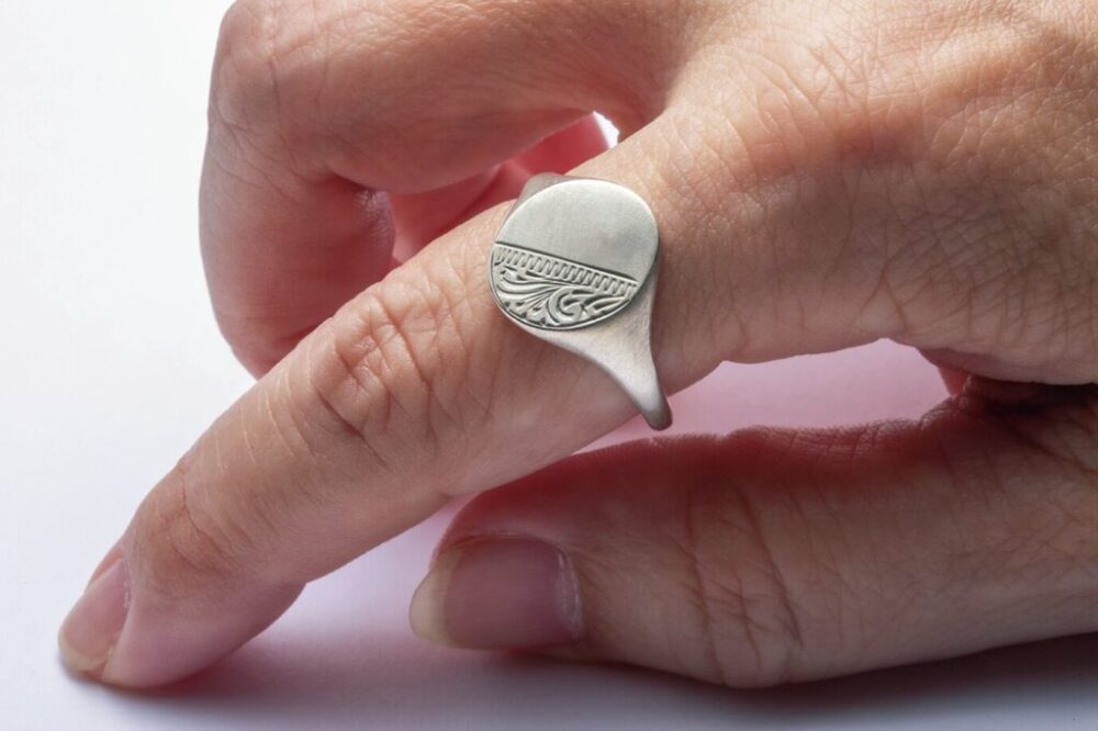 オーバル型のトップの繊細な彫刻を施したリング。彫刻も半分だけ、しかも着けたときに斜めになるように入れるというオリジナリティのあるデザインが魅力だ。ボディはシルバー925で、擦ったような仕上げすることで、熟れ感があるのもいい。トップが比較的小ぶりなので、他のリングと組み合わせても面白いだろう。リング幅最大13㎜程度(リングサイズ5号~19号まで製作可能)。1万2100円