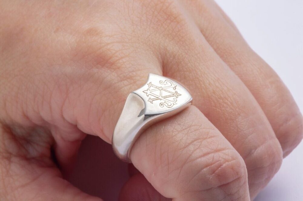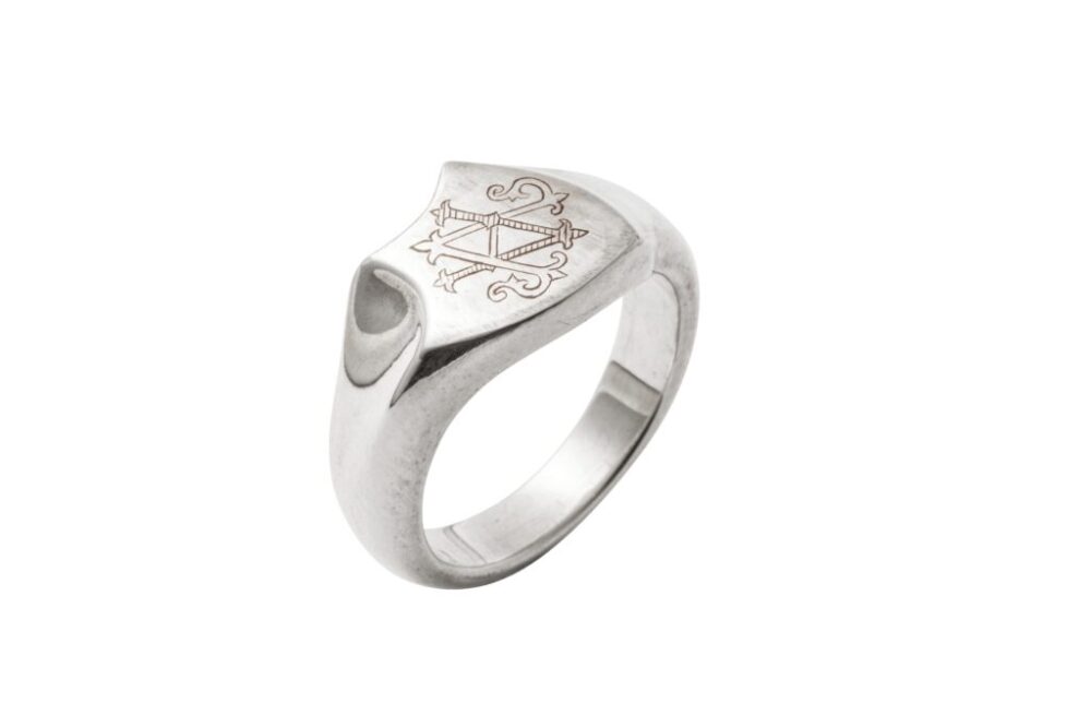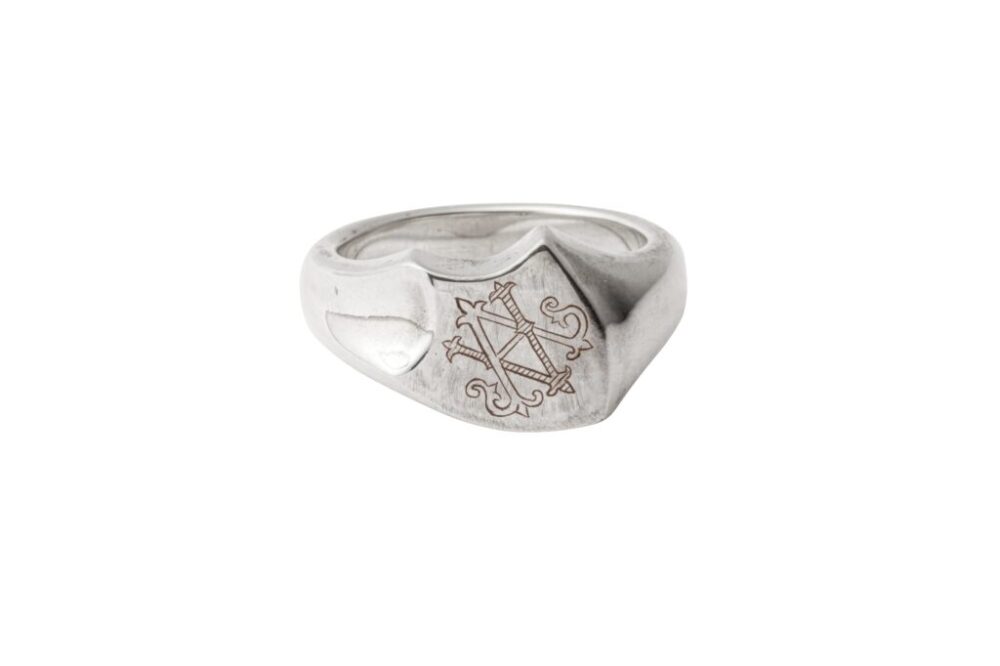 トップにブランド名の由来である「VERSE(詩 )」、「ANTIQUE(古めかしい物)」のイニシャル“VA”を刻んだシグネットリング。19世紀のシールド型を採用したフォルムで、手彫りの彫刻のモノグラムにも当時の書体を取り入れている。ヒストリックの中に現代的な要素も加えたデザイン。オンリーワンでありながら主張しすぎないところも魅力だ。リング幅最大12㎜程度(リングサイズ5号~19号まで製作可能)。1万2100円