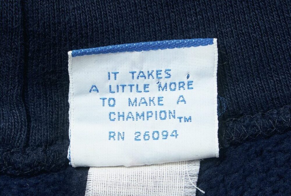 ネームタグと別で品質表記タグが付いているアイテムには、ネームタグの裏に下のようにメッセージが記されている。これは、「チャンピオン」が1980年に特許申請しているキャッチフレーズである。