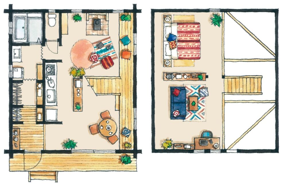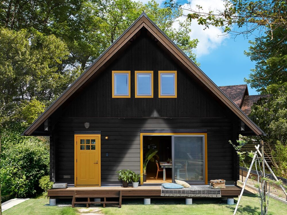 せり出した深い軒が特長の「キャンティ屋根」。おおらかで素朴なログの風合いに、個性的なカラーリングで遊びごころを加えた。