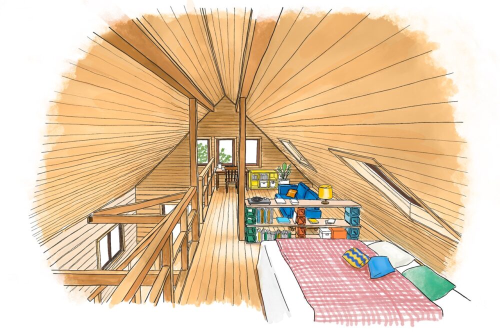 ログハウスならではの斜め天井と天窓がポイントの、秘密基地のようなロフトスペース。開放的な吹き抜けともつながり、光が差し込む明るい空間だ。