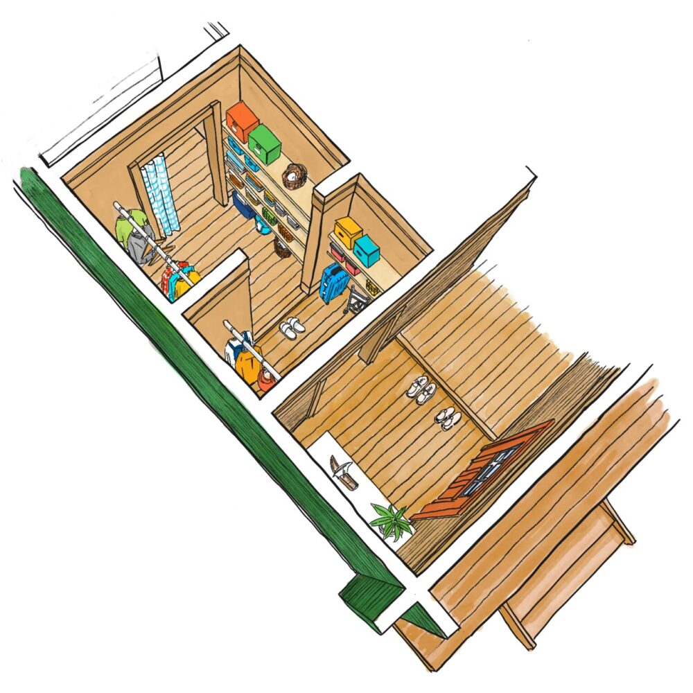 遊びごころをテーマにしつつ、合理的な一面も。玄関からひとつながりの収納スペースとウォークインクローゼットは、水まわりともつながっていて、生活動線がスムーズで使い勝手のいい間取りだ。