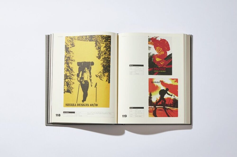 その進行中のアーカイブを見ながら、本の完成を楽しみにしていた気持ちは今でも忘れません。そして、2025年5月、その本がついに出版されました。本書には、「サロモン」「ザ・ノース・フェイス」などの著名ブランドから、レアなローカルブランドまで、70以上が登場する384ページの大作。登山の荒々しい写真や、キャンプの温かみのあるイラスト、美しい自然風景など、アウトドアシーンが余すところなく掲載されています。