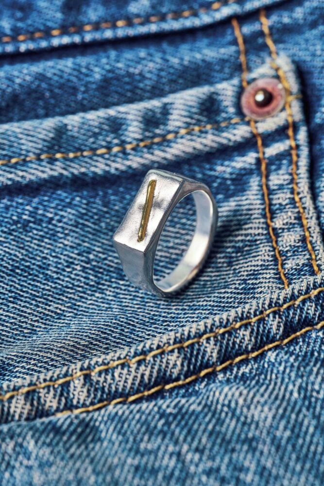 シルバー999の台座に24Kゴールドの糸が右上がりに縫い込まれているようなデザインはどんなコーデにも合う。ゴールドは職人の手で丁寧にロウ付けされる。