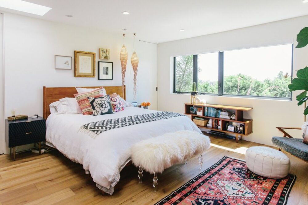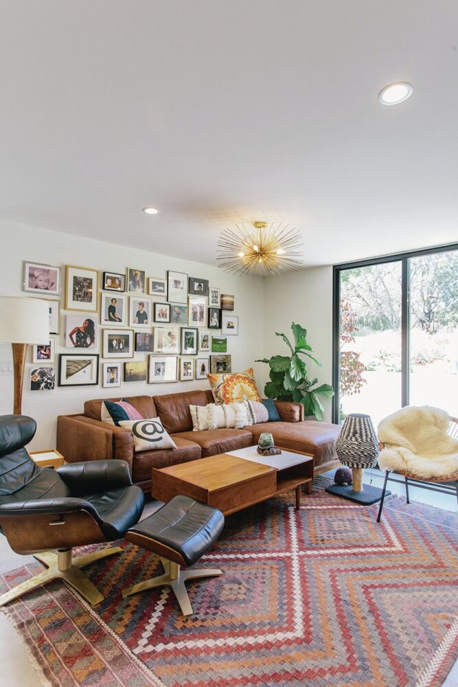 家の基本的なラインはいじらず“栄光の’60年代デザイン”を自分たちなりに再現したいというコンセプトでリモデルしたそうだ。横長の平屋には床から天井までの大きな窓が両サイドにあり、さらにスカイライトから注ぎ込む光で、室内はとにかく開放的で明るい。インテリアはシンプルな白を基調としながらも、キッチン、暖炉、バスルームなどに、個性的でセンスの良いタイルがあしらわれ、変化を与えている。