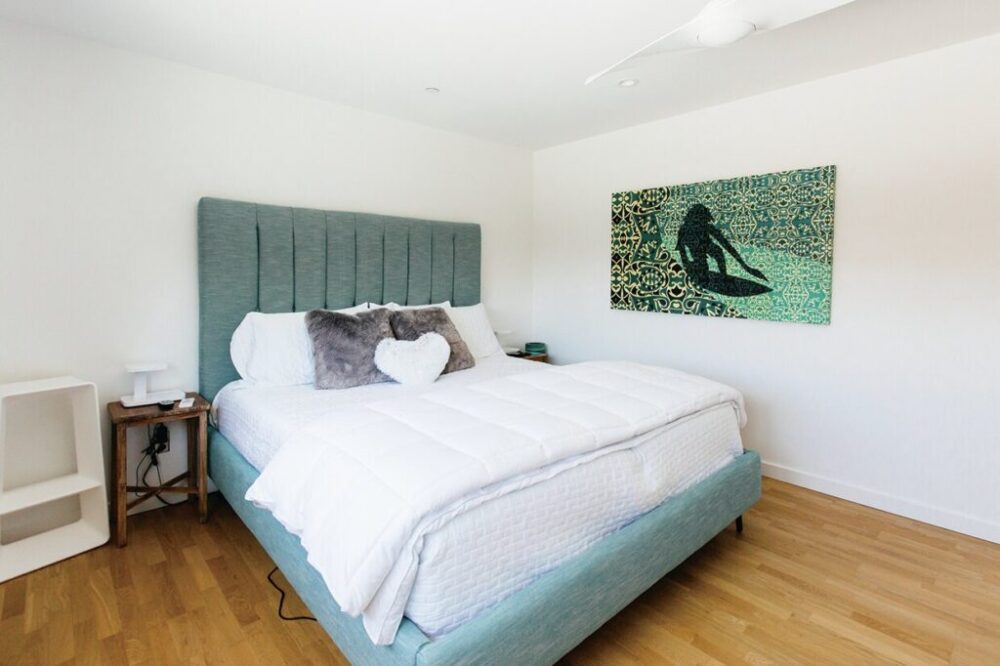 エンシニータス北部のムーンライトビーチまで徒歩3分という好立地に立つモダンデザインで仕上げられたこの家は、ビーチシティでの豊かな暮らしを追求するサーフサイド・プロジェクツの作品。元来ミッドセンチュリーモダンに、強烈にこだわっていたわけではなかったというオーナーだが、気になるオレンジのドアを開いた瞬間、目に飛び込んできたブルーカラーのキッチンを見て、この家に一目惚れしたのだと言う。