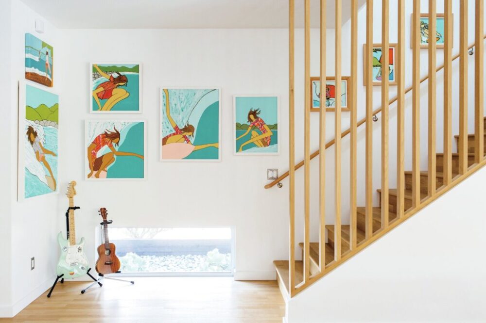 一方、室内にはオーナーが愛して止まないローカルのアーティスト、アンディ・デイビスの作品がなんと60点以上も飾られ、まるでアンディのギャラリーかと目を疑うほど。全てのアートがコピーではなくオリジナルピースなのだから、下世話な話だがそれだけでもなかなかの価値。それぞれの作品も、オレンジとブルーが基調になっているもので揃えられ、家全体のムードにしっかりとした統一感を与えている。