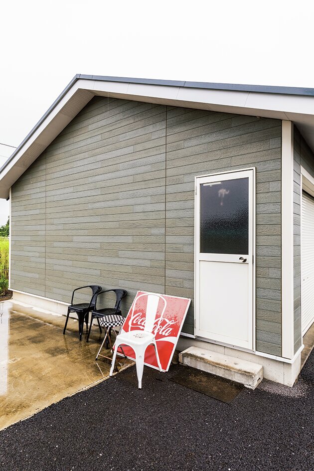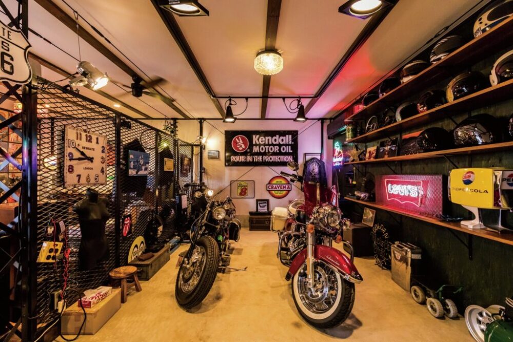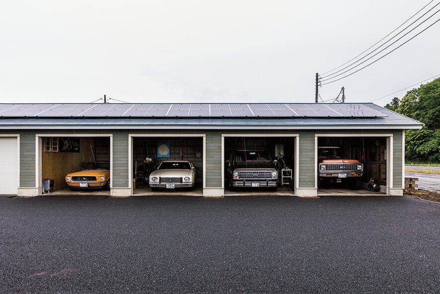 栃木県の粂川さんは、自宅敷地内に大好きなアメリカ車やハーレーを収めるため、今から9年ほど前にガレージを建てることとなった。農業用ハウスの中古の骨組みを流用することで、通常よりもかなり格安で建てることができたというガレージは、横に長い構造で、シャッターが6枚も並ぶ。そのうち4枚分のスペースには大好きなアメリカ車が格納されているが、今回紹介するのは、残りのシャッター2枚分のスペースだ。