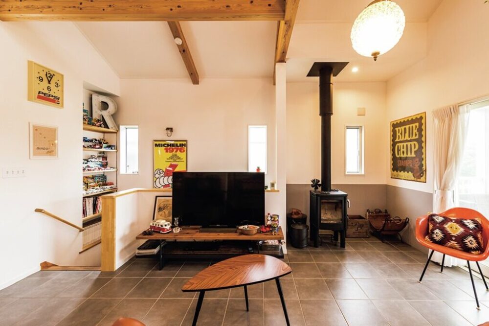 「靴のままどうぞ」と言われて階段を上がると、半分が土間スペースとなっているリビングが広がる。この土間スペースは2Fに薪ストーブを設置しているためで、木屑や灰を掃除しやすいというメリットもあるそうだ。