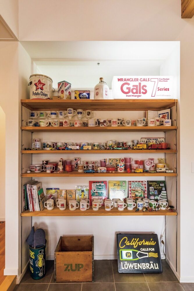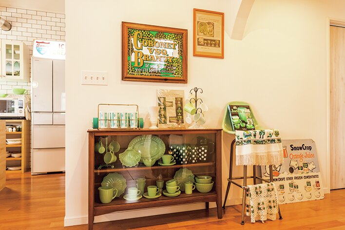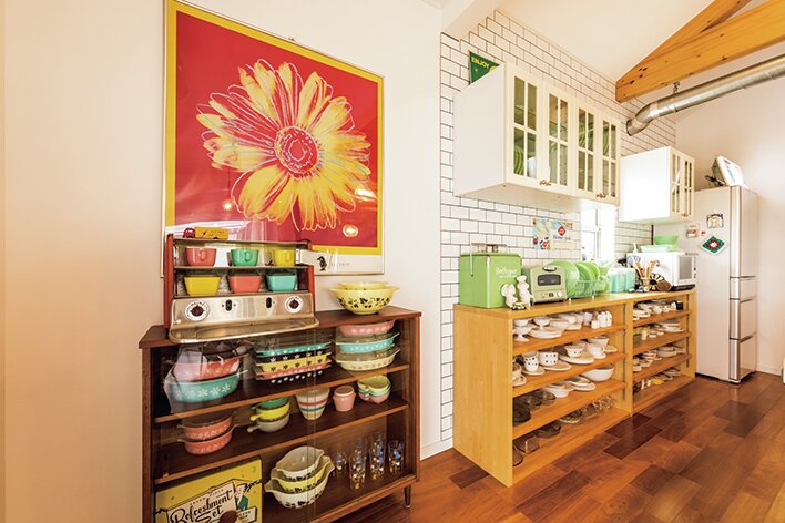 キッチンだけでなくリビングの各所にある棚の中にも大好きなファイヤーキング&パイレックスの食器がギッシリ!