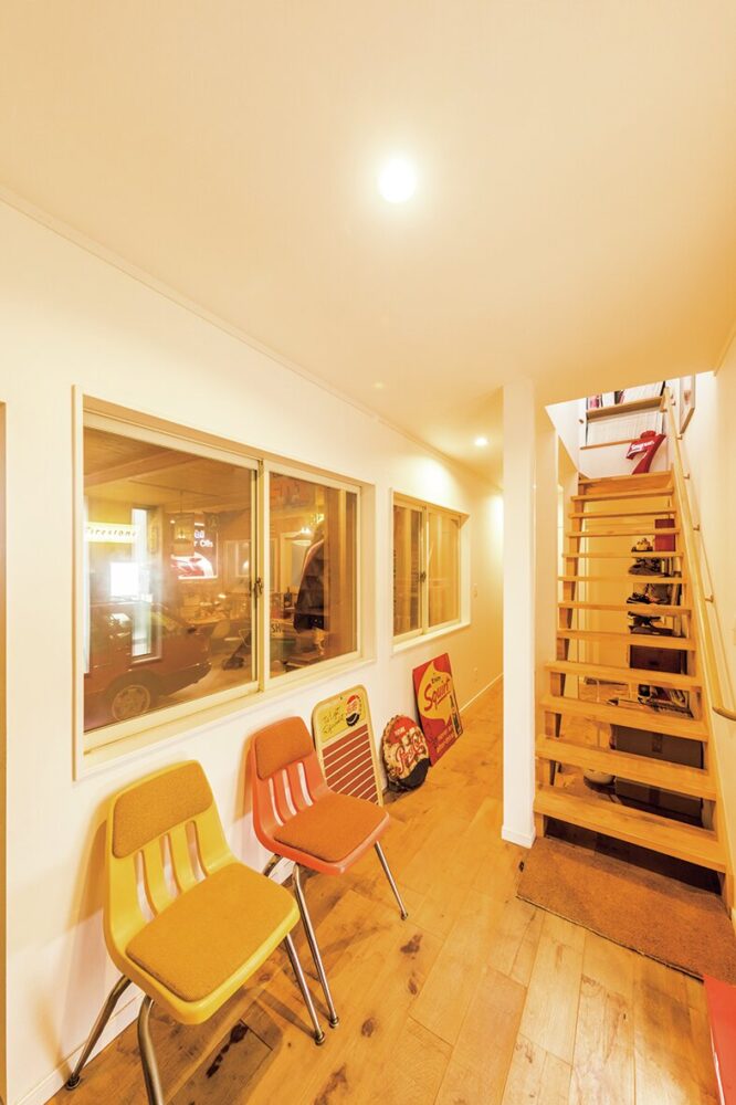 玄関を入っても靴を脱ぐスペースはなく、「そのまま2Fへ上がってください」。階段の奥にはガレージからもアクセスできる客間があり、訪れた友人が泊まることができる。