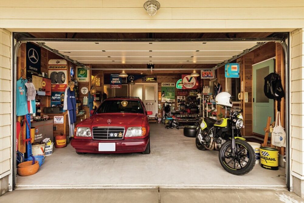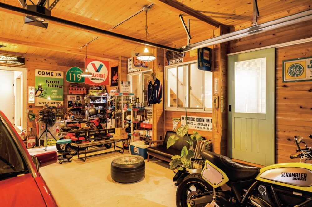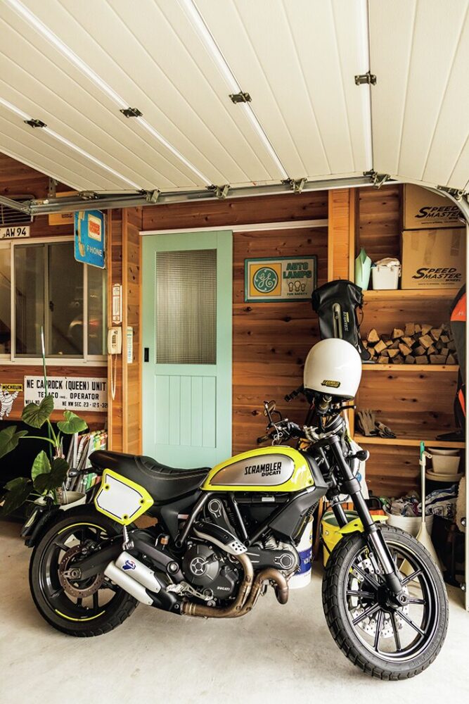 ガレージには玄関内側の廊下からもアクセス可能。ちなみに康次さんの愛車はW124ワゴンとドゥカティのスクランブラー。