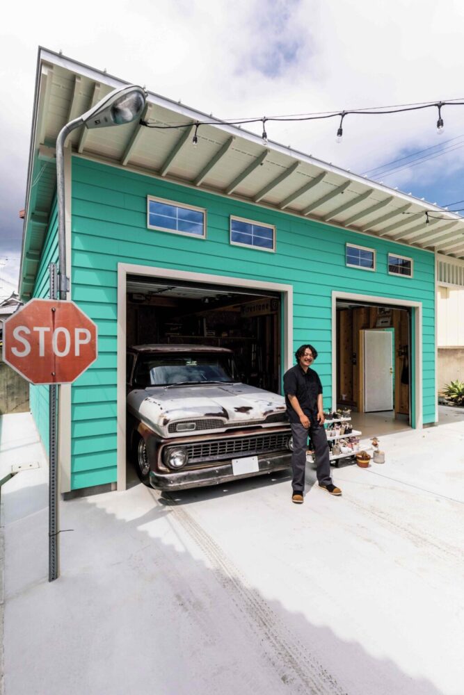 地元が一緒だった縁で昔からホットビルドのJUNさんを知っていたため、ガレージは彼に依頼することに。木造でクルマ2台が余裕で収まる巨大なサイズだが、太い梁を使用し、2枚のシャッター間に1m弱の壁を設けることで柱なしの広い空間が広がる。