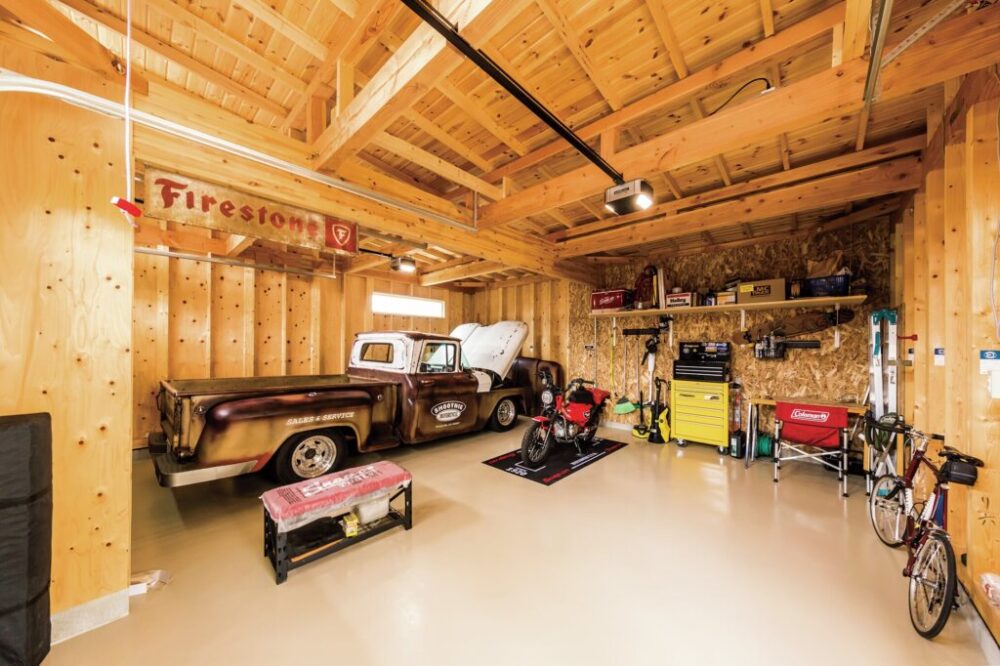 木の温もりが漂うガレージは内装をDIYで仕上げ中!