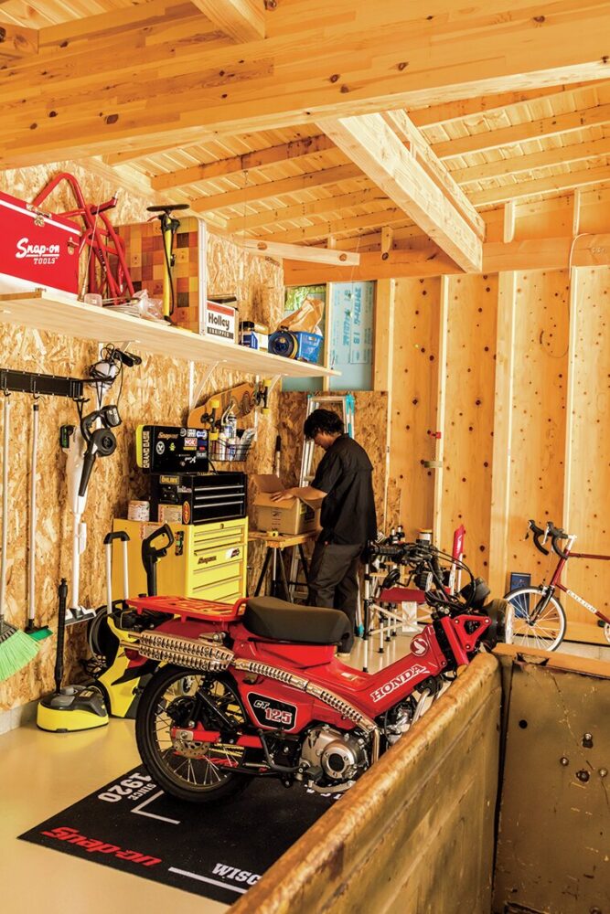 ガレージ右奥のみひと足先に壁面が完成。大きな棚を設置し、ツールチェストや作業台などもあり、簡単な整備はできる環境となっている。