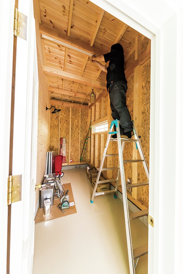 ガレージ脇には幅1.8mほどの部屋を設置。ここを将来自分の書斎スペースとするべく、現在内装工事を自分で行なっている最中だ。