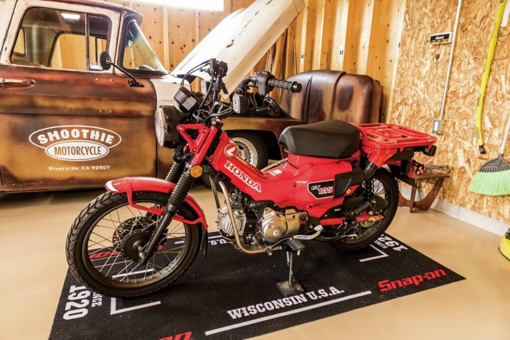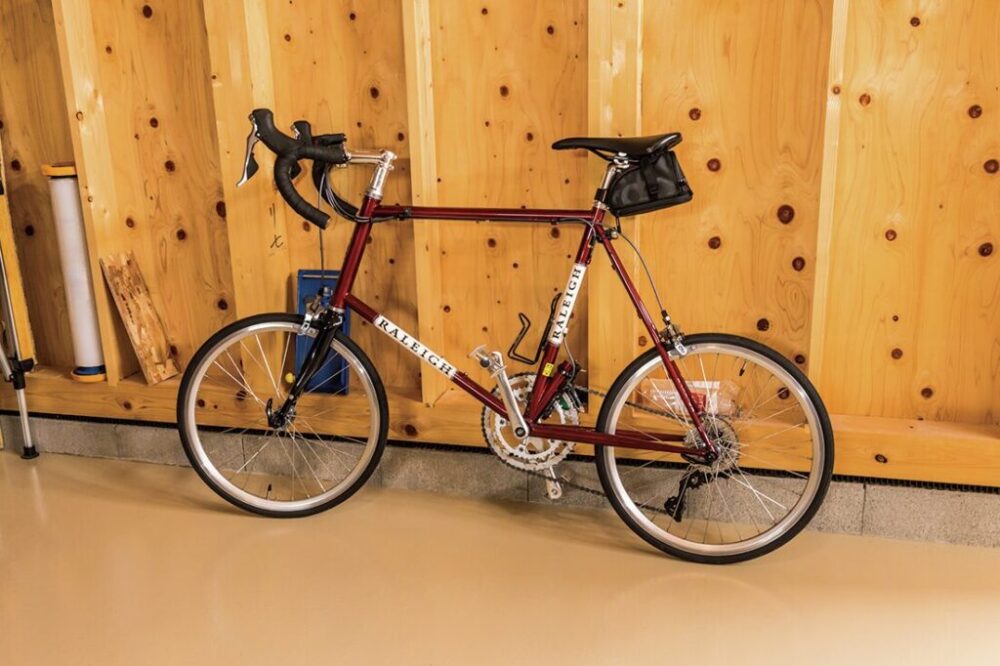 発表と同時に注文したというCT125ハンターカブは、生産初期のモデル。20インチとタイヤ径が小さいロードバイクは、イギリスのラレー社製。この他にも現在ショップに入院中のカワサキZ1Rを所有しており、ガレージ右側半分はそんなバイクや自転車のスペースとなる予定。