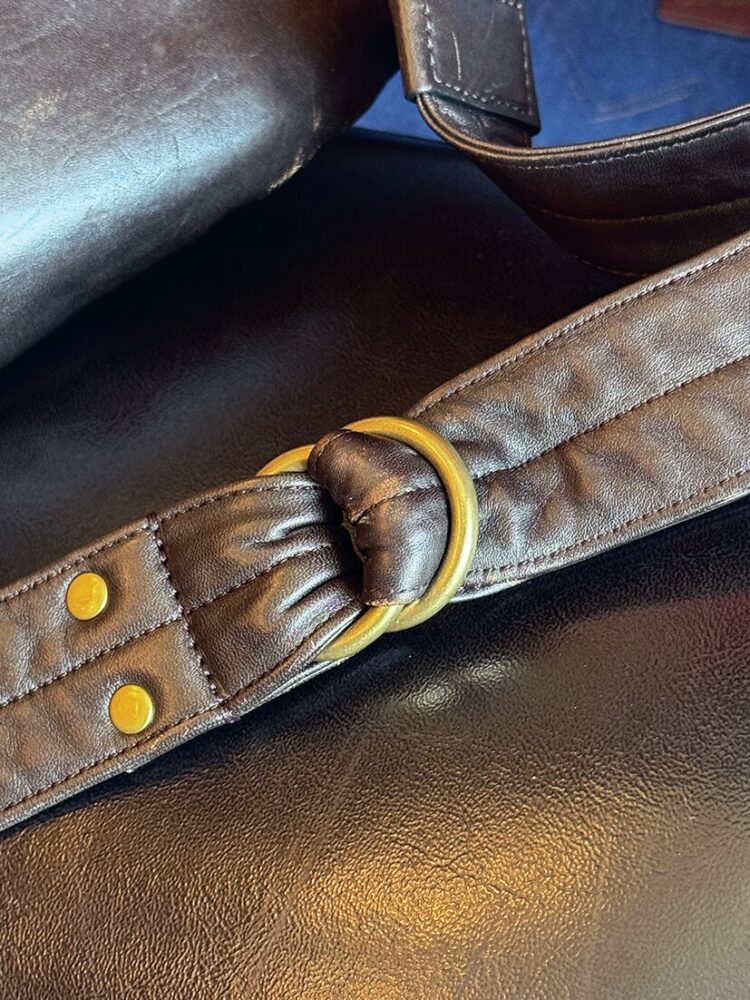 ダブルリングでストラップを留める仕様。長さ調節が可能なので、季節ごとの服装の違いや体型の変化にも順応してくれる。リングやリベットはブラス製。
