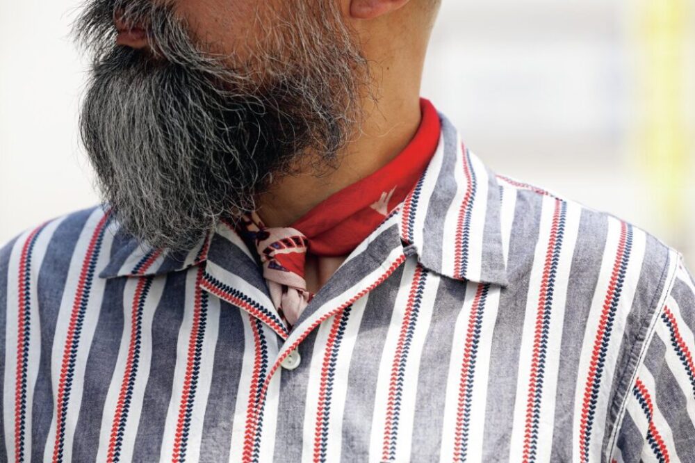 装いがシンプルになりがちな夏は首元に遊び心を。バンダナはその選択肢のひとつだ。アイキャッチにもなる赤は、シャツのストライプの色ともリンクしている。
