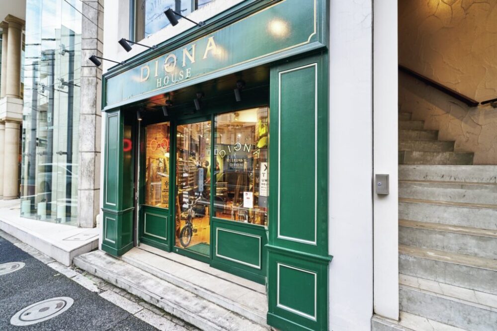 ヴィンテージ感のある深いグリーンを基調にした外観が印象的なディグナハウス原宿。落ち着いた佇まいで、通りを歩く人の視線をさりげなく引きつける。ガラス扉を開けて店内に足を踏み入れると、ウッドを基調としたインテリアが目に入り、空間全体にやわらかな温もりが漂う。フロアには、経年変化を楽しめるアンティークの什器や家具が丁寧に配置され、ディグナの世界観はもとより実用性と美しさを兼ね備えた空間が広がっている。
