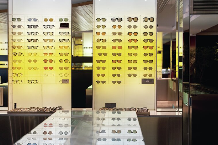 7各店でオーナーが敬愛する1950〜60年代の旧車を設計コンセプトに設けており、当店はシトロエンのDSをイメージ。アイウエアショップでは珍しく落ち着いた暗めの照明になっており、まるでギャラリーのようにブランド毎にディスプレイされている。