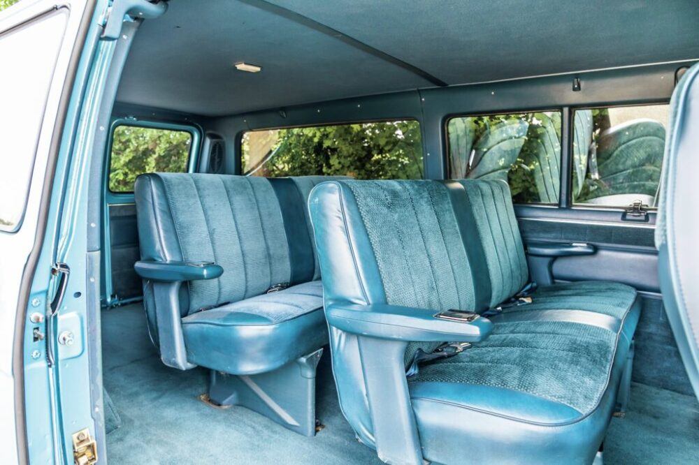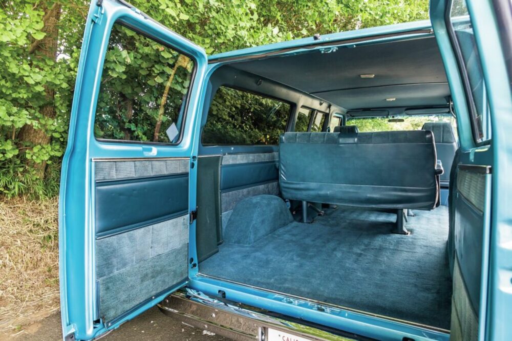 パッセンジャーモデル故にカーゴスペースには前後2列のシートが並ぶ。ブルーのシートはオリジナルで、状態もかなり良い。ちなみにこの状態でもラゲッジスペースはゴロ寝ができるほど広い。