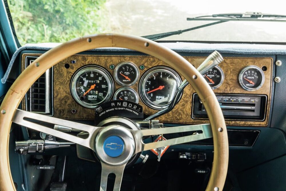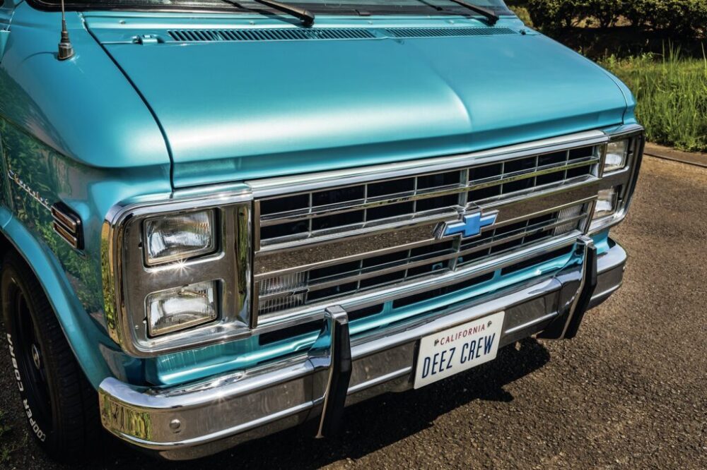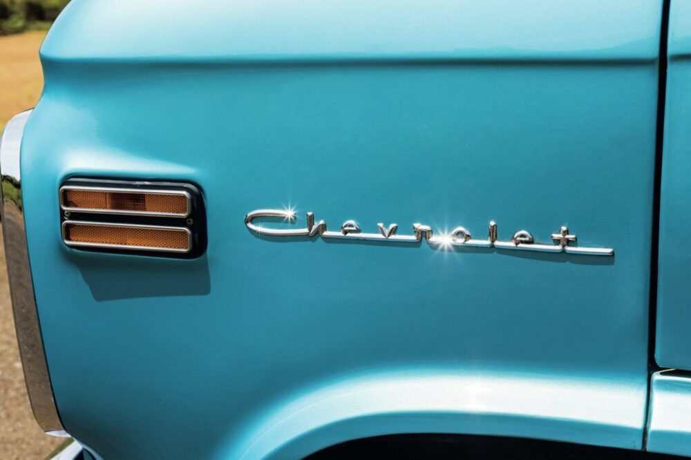 フロントフェンダーのChevroletエンブレムは別の車種から流用したもの。本来はCHEVY VAN 20のバッジが備わる。