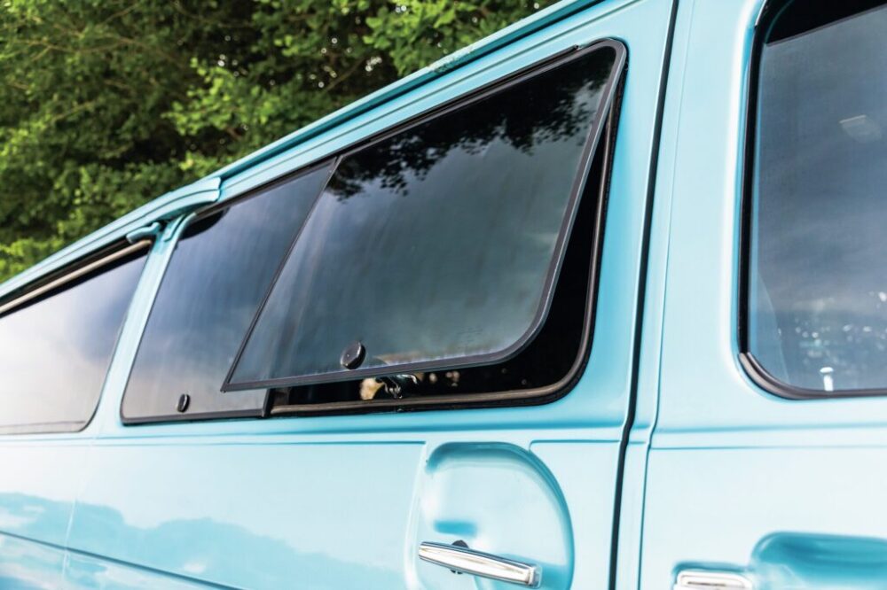 側面のスライドドアとその反対側の窓は前後で2分割となっており、下側が開くポップアップ構造となる。