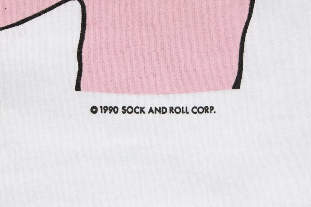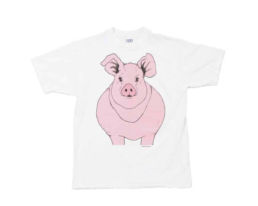 ソックスのブランドが’90s初期に作ったプリントTシャツ。セットになるのは、チューブソックスにブタちゃんの足がプリントされている。これを着て手にソックスを付けるか、ソックスを履くかでデザインが完成する。9900円(ミスタークリーンTEL090-2206-1755)