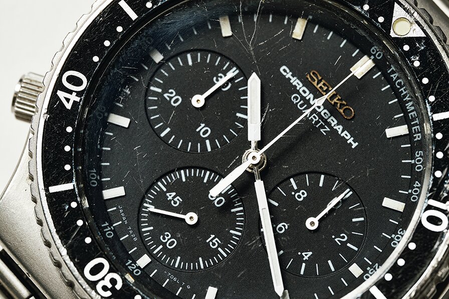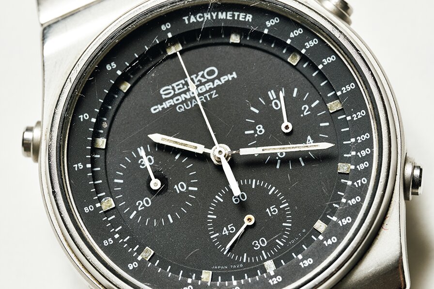 1982年に発売したセイコー初のクオーツクロノグラフ、『SPEEDMASTER』というモデル。その最初期が7A28という品番で、左がダイバーベゼル付きの7A28-7040、右がベゼル無しの7A28-701A。他にも様々なバリエーションが存在し、中にはジウジアーロがデザインしたものも。英空軍は1980年代半ば〜’90年に7A28-7120を採用した。