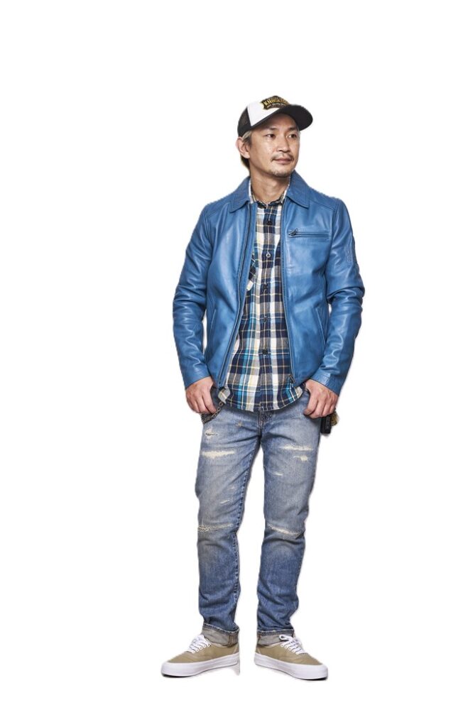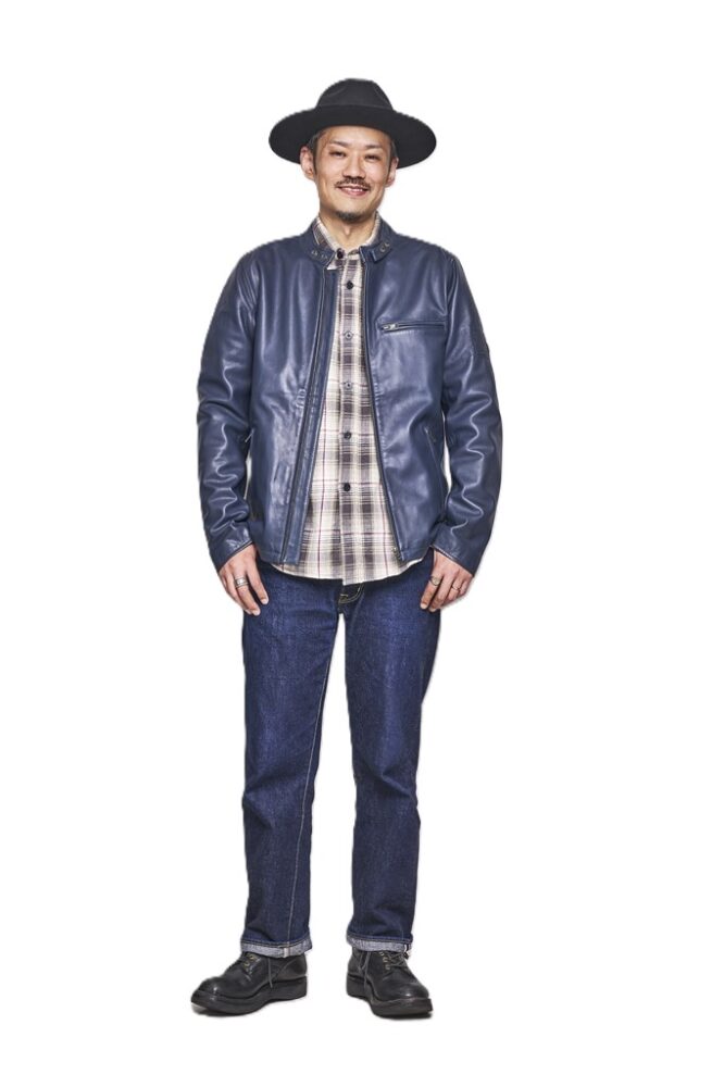 「これぞ王道アメカジといえる武骨なスタイリング! ややサイズアップしたジーンズをちょっと落として穿く“腰パン” も1990年代のアメカジブームを経験した世代ならではだけど、実はいま若い世代の間で再燃中。ネルシャツの色を変えるだけで全体の印象がガラッと変わるのでそれも楽しい! 帽子と革ジャンとブーツを同系色にして、横浜らしくブルーで統一感を出してみるのもありかも!」