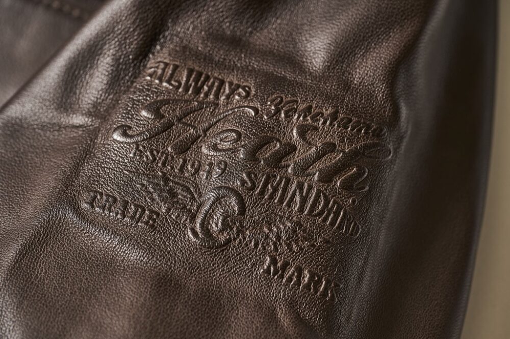 首元のネームラベルは、革の台座に鎮座。英国などヨーロッパのヴィンテージモデルにも見られる凝った仕様を踏襲している。