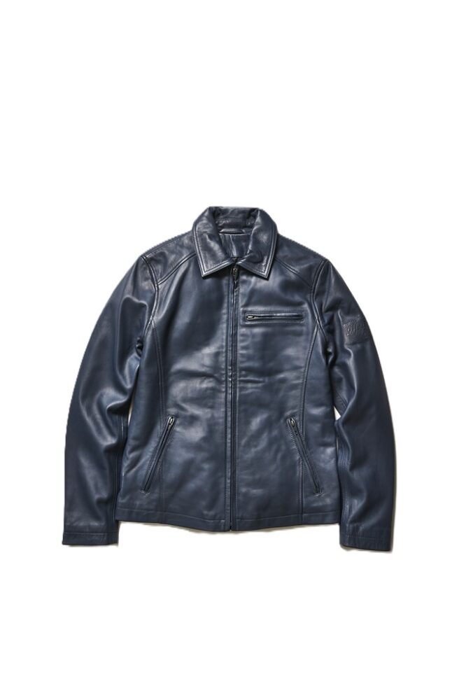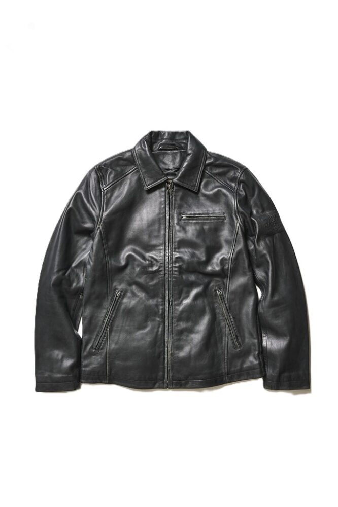 左上腕にブランドロゴが型押しされており、シンプルなライダースJKTのさりげないアクセントになっている。