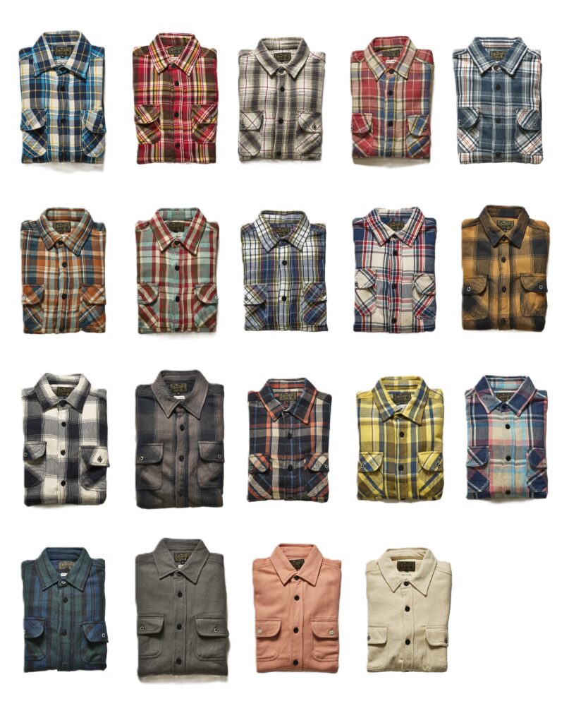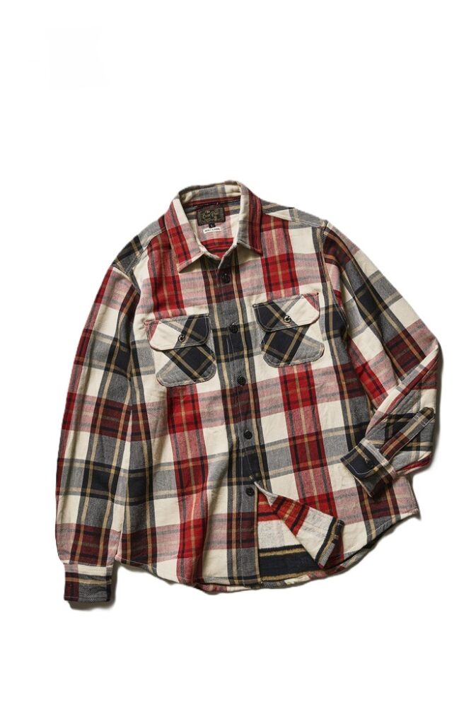 ヴィンテージ感抜群のヘビーフランネルシャツ。コットン100%で裏起毛の風合いもすばらしく、正直この価格は驚異的だ。オリジナルのロゴ入りメタルボタンもポケットに装備。全20色展開で各7990円!!