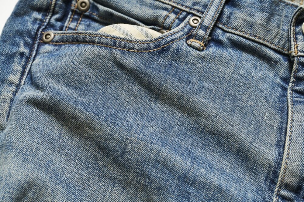 同じくカイハラ社製の12.5oz.ストレッチデニムにヴィンテージ加工によってかなり穿き込んで淡い色合いになった風合いを再現。爽やかさが魅力だ。2万4990円
