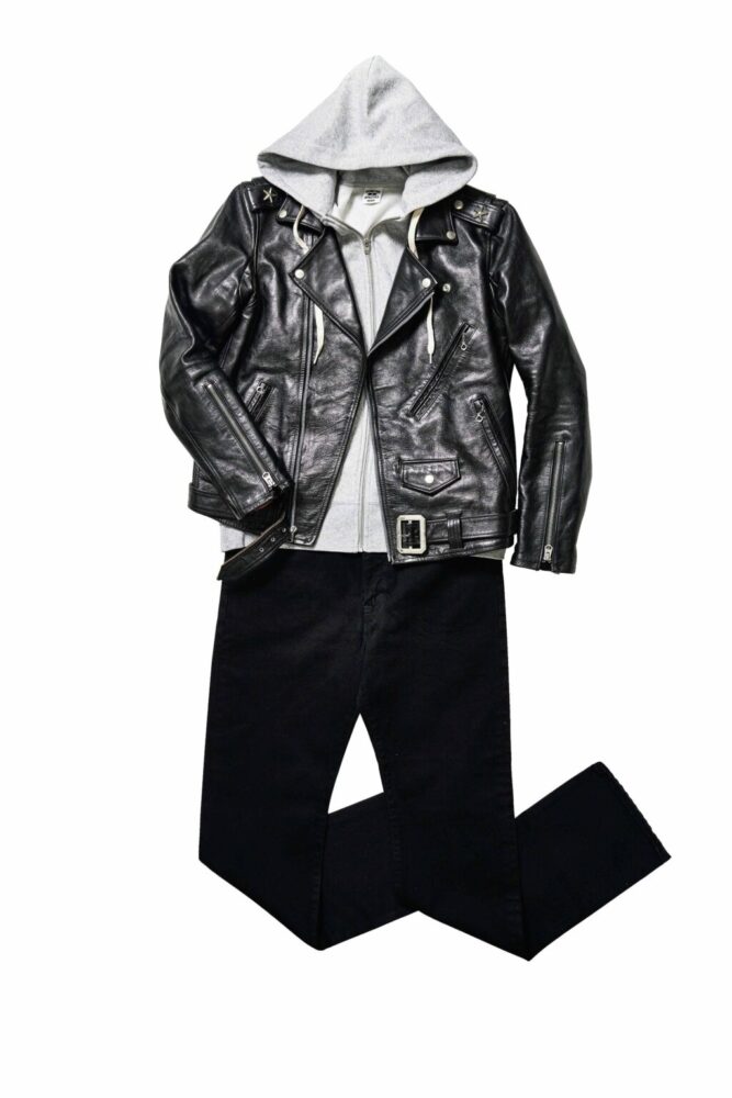 革ジャンとスウェットを合わせるコーデは定番だが、とかくスウェットが厚手でゴワついたりしてしまうもの。でもこいつなら、革ジャン用に9oz生地で作られているので、着膨れすることもなくすっきりと着ることができる。ジャストサイズの革ジャンでも、難なく重ね着ができるはずだ。