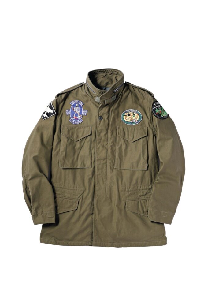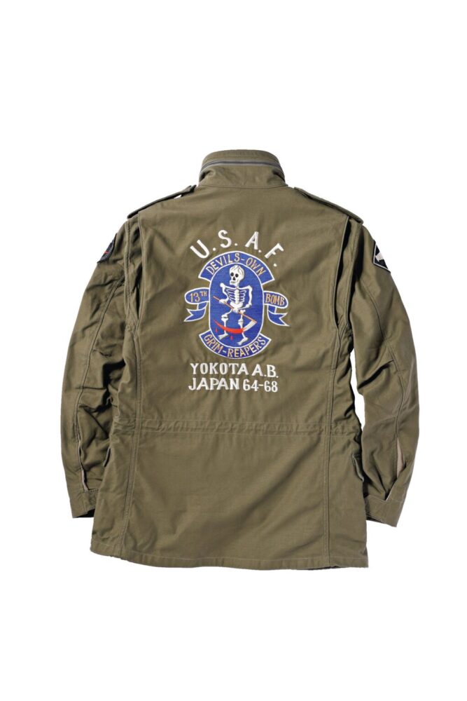 ベトナム戦争中、第13爆撃飛行隊は双発ジェット爆撃機キャンベラに乗って数多くの作戦に参加。韓国、日本、南ベトナムなど様々な地へと降り立ったパイロットたちは、束の間の休暇で各地のパッチショップやカスタムショップに自身のジャケットを持ち込み、自分だけの1着を完成させた。この[M-65]は、日本特有の豪華な刺繍を背面に、そして両胸、両袖にパッチを施したスペシャルな仕様となっている。9万4600円