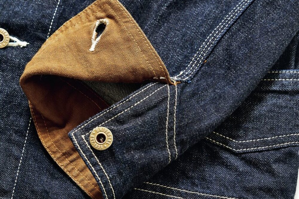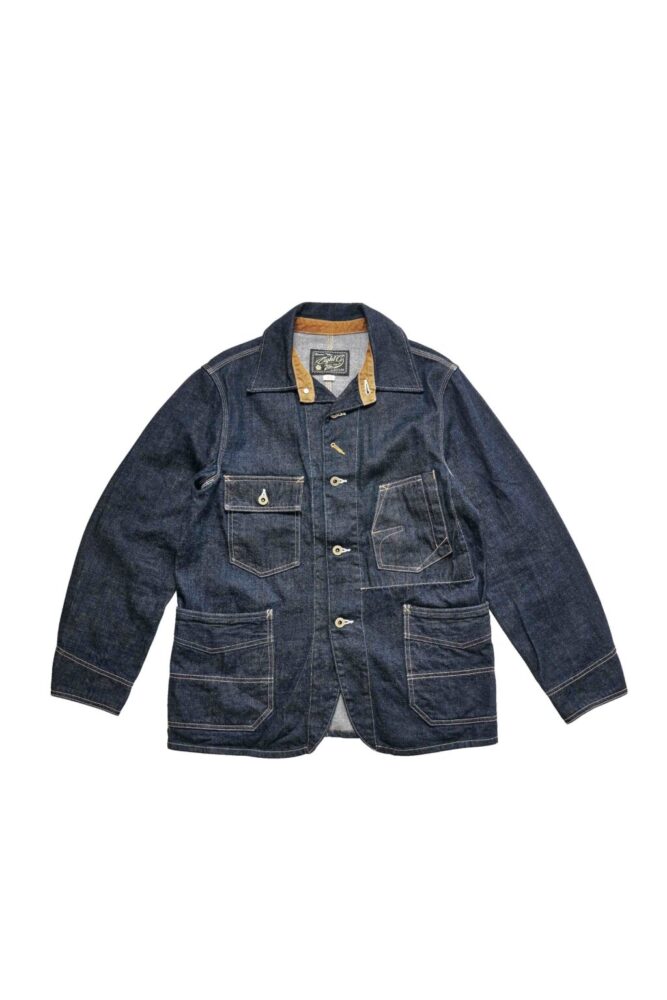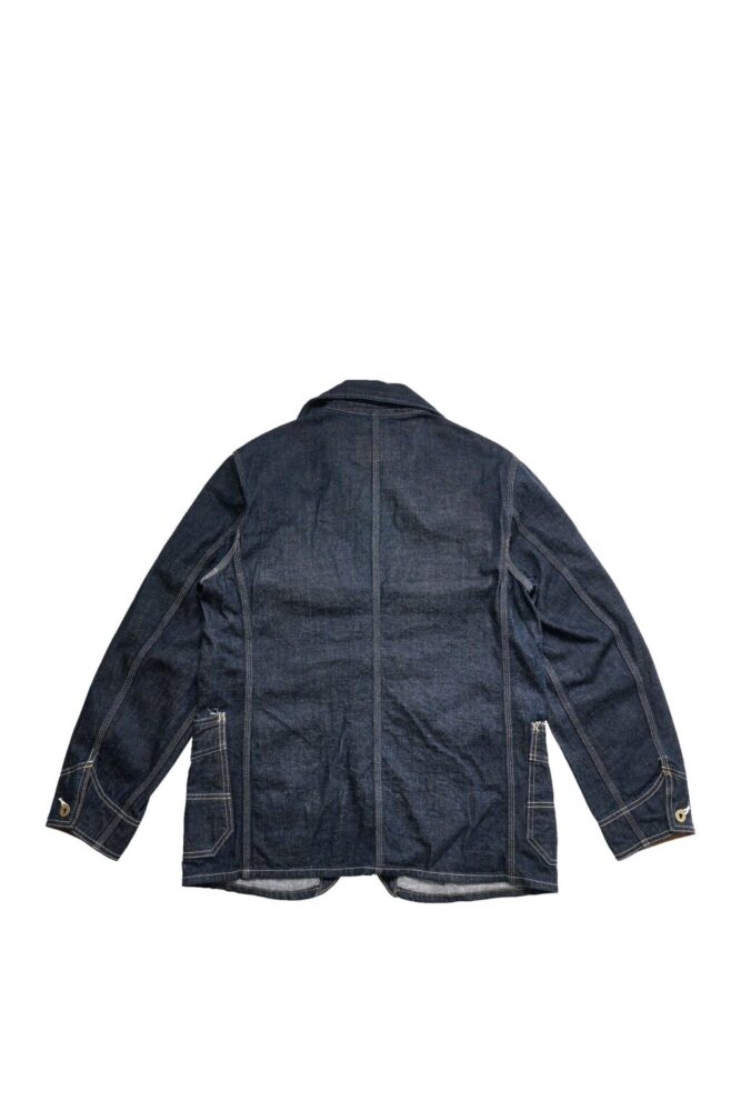 1920年代のヴィンテージ・レイルローダーコートを現代的に再構築。鉄道員が着た丈夫な作業着をモチーフに、トリプルステッチの縫製と、コシの強い11.5ozデニムを使用したタフな仕上がり。ブラウンダック生地の当て布やサビ加工のボタンなど細部まで抜かりがない。2万8600円